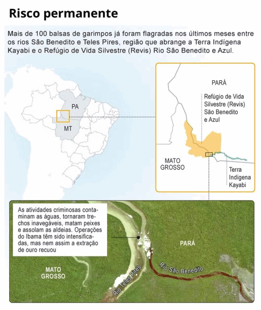 Mesmo após sete operações de combate neste ano, balsas de garimpo ilegal se multiplicam no Sul do Pará, que vai receber em Belém a COP30 em novembro. Os garimpeiros atuam na Terra Indígena Kayabi e no Refúgio de Vida Silvestre Rio São Benedito e Azul, criado pelo governo paraense em 2021. Segundo moradores, o garimpo nunca foi tão intenso quanto agora, principalmente devido à cumplicidade de alguns indígenas, que cobrariam comissões para permitir a extração de ouro. A Funai confirmou o problema.
